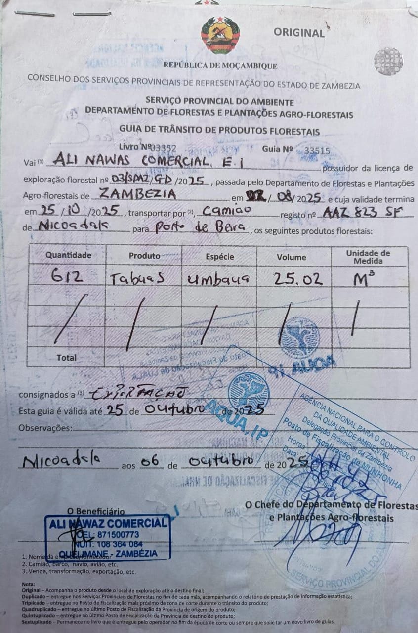 Em substituição do procedimento legal, a Ali Nawaz utilizou apenas uma Guia de Trânsito n.º 33515, emitida a 6 de Outubro, para transportar a madeira de Nicoadala, na Zambézia, até Sofala. Este expediente serviu para contornar o controlo fiscal, permitindo que a empresa evitasse o pagamento de impostos e transitasse pelos vários postos sem fiscalização.
