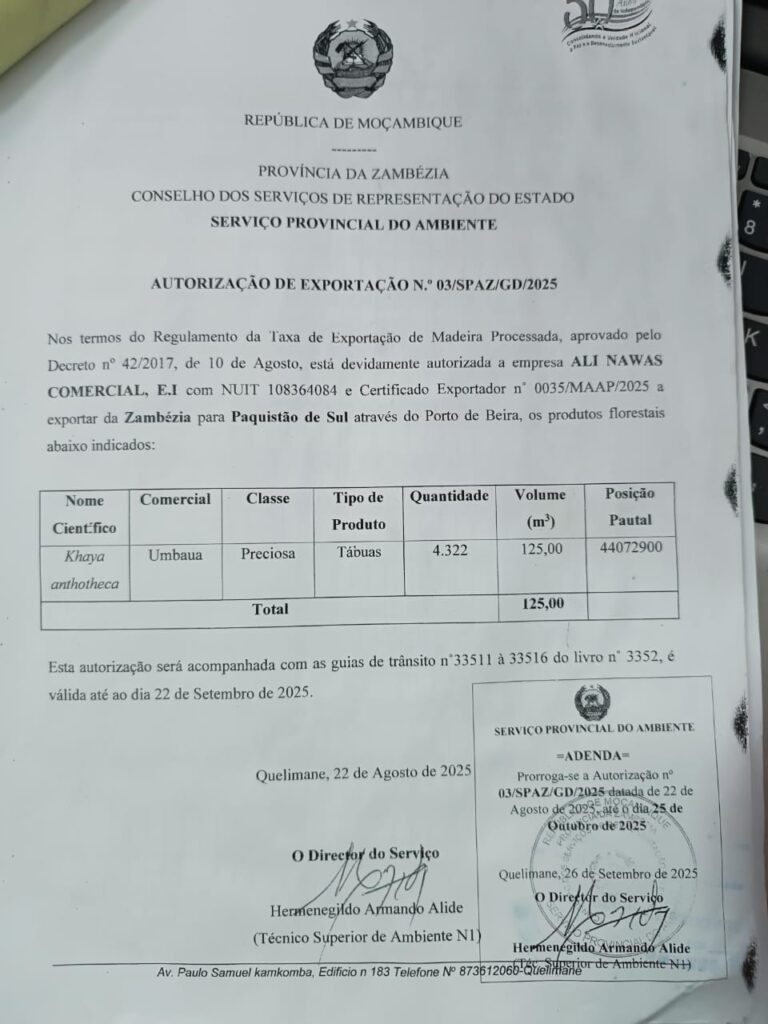 Documentos confirmam que a empresa se preparava para exportar cinco contentores de madeira com destino ao Paquistão, a bordo do navio MSC ISHYKA, com partida agendada para 7 de Novembro. Contudo, o esquema foi interceptado a tempo e já foi denunciado à Procuradoria Provincial da República de Sofala.